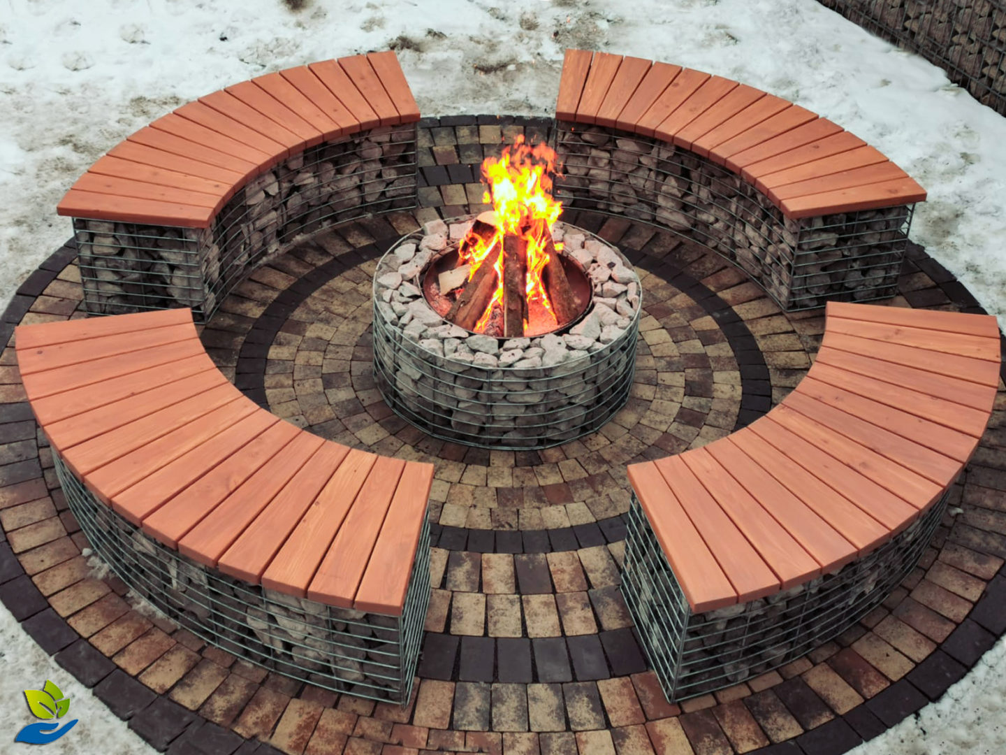 Panchina Trento completa di braciere da giardino composta da 4 panchine radiali con seduta in legno di larice, preassemblate con riempimento pietra in loco.